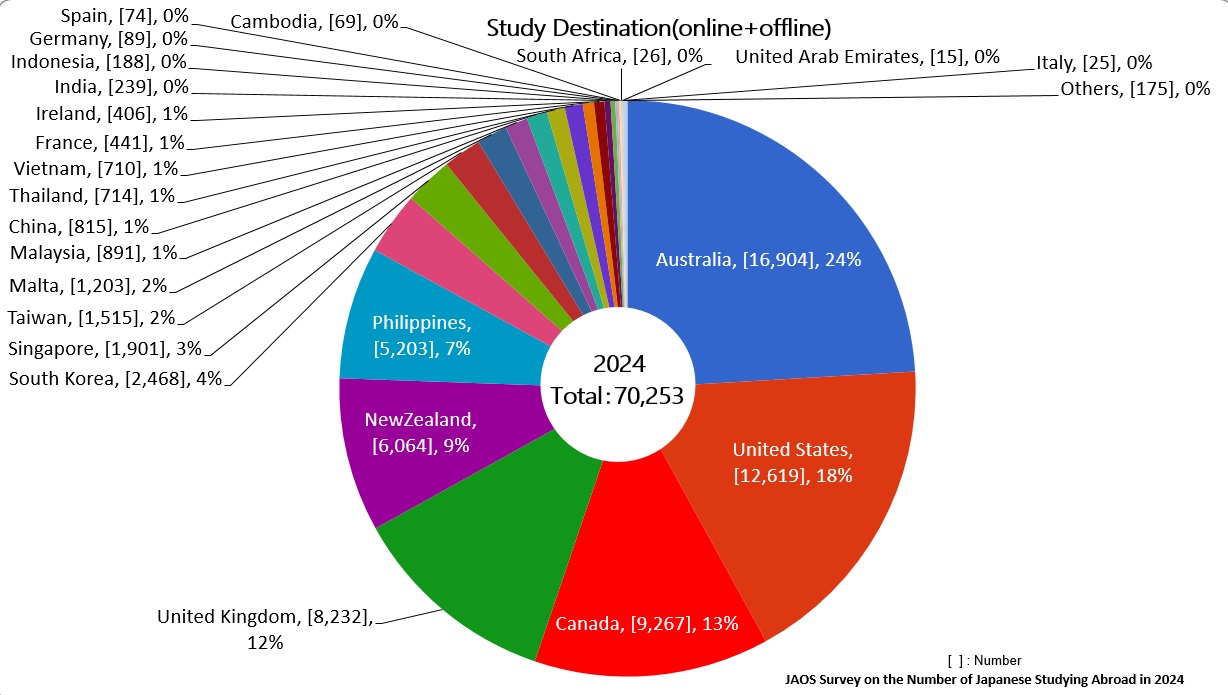 To promote the healthy growth of study abroad businesses and study abroad programs in Japan , the Japan Association of Overseas Studies (JAOS; Chairman: Yoshikazu Ueoku ) consisting of 63 o rganizations including private education agencies and foreign government institutions, compiled the results of its 2024 survey on the number of Japanese student s studying abroad. Conducted in April 2025, the survey targeted 39 JAOS member agents.